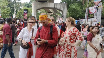 বাঙালির প্রাণের উৎসব পহেলা বৈশাখ উপলক্ষে ঢাকা বিশ্ববিদ্যালয়ের চারুকলা অনুষদ থেকে শুরু হওয়া বর্ণাঢ্য শোভাযাত্রায় যোগ দিতে বিশ্বের বিভিন্ন দেশ থেকে আসা বিদেশি পর্যটক ও আন্তর্জাতিক গণমাধ্যমকর্মীদের ভিড় লক্ষ্য করা গেছে। লাল–সাদা সাজে সজ্জিত হয়ে তারা শোভাযাত্রার রঙিন মুহূর্ত উপভোগ করেন এবং বাঙালির সংস্কৃতি, ঐতিহ্য ও অসাম্প্রদায়িক চেতনায় মুগ্ধতা প্রকাশ করেন।